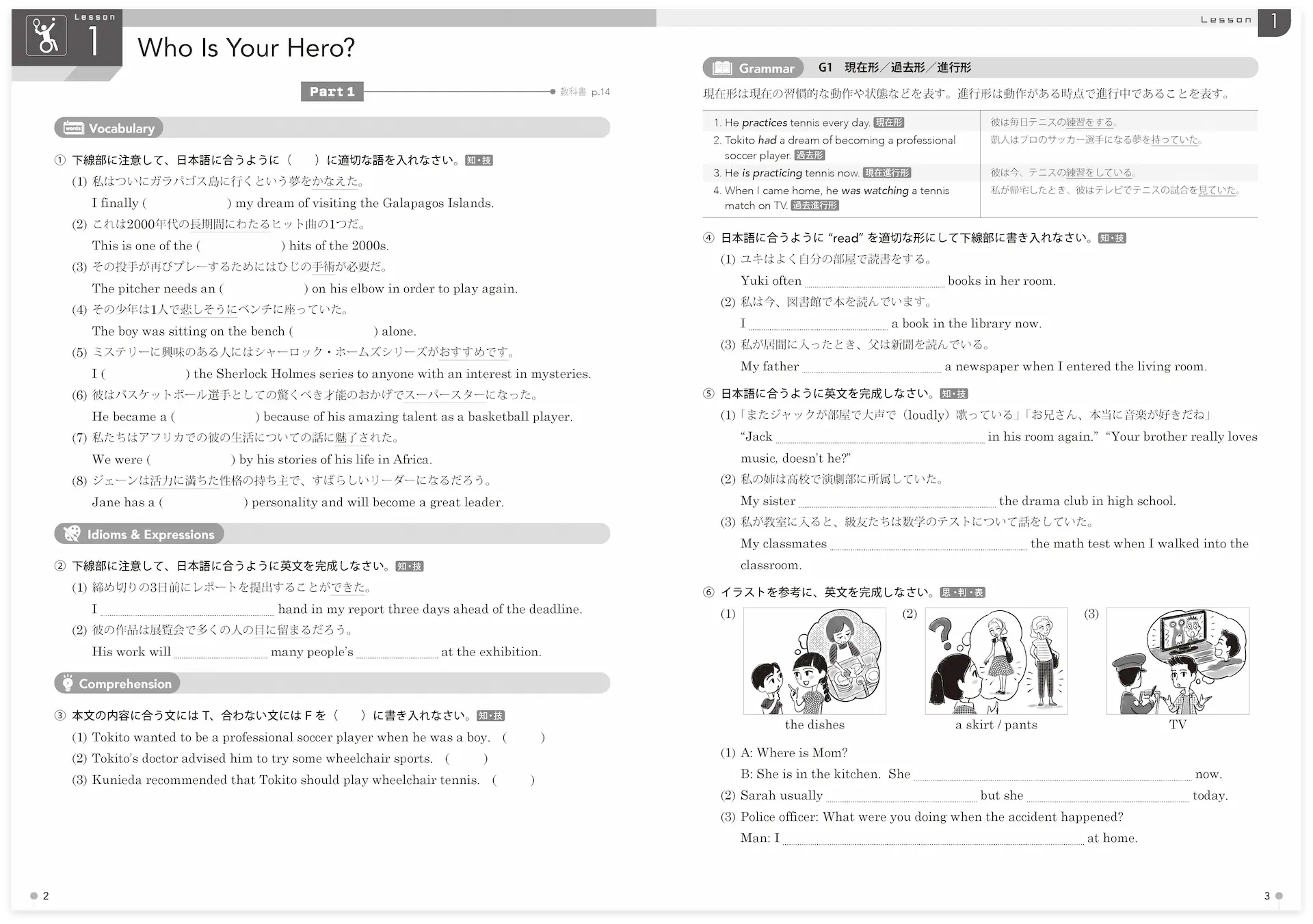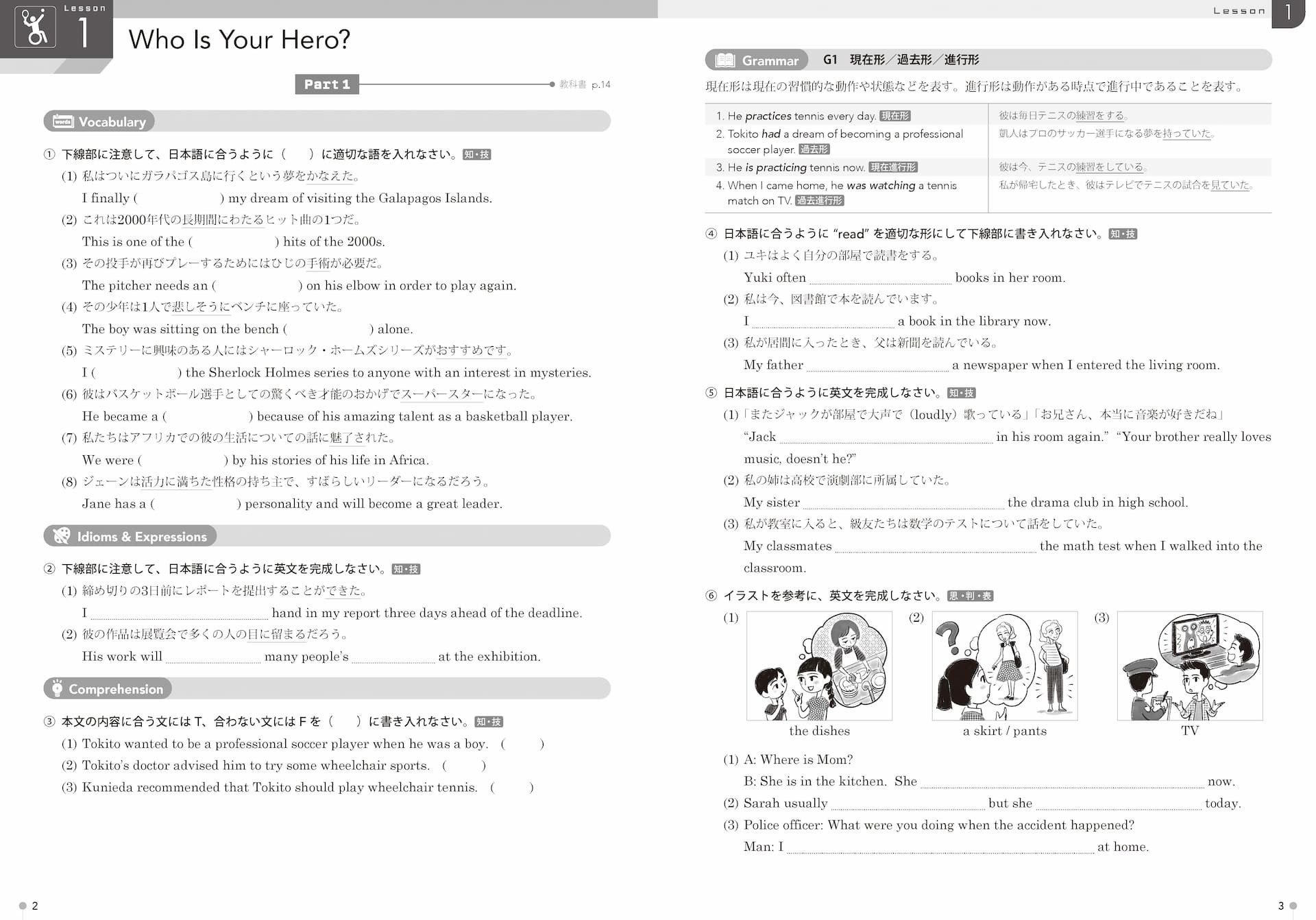 教科書のGrammar で学習した文法項目を定着させるための問題です。空所補充、語形変化などの知識を確認する問題と、イラスト描写などの表現力を問う問題があります。