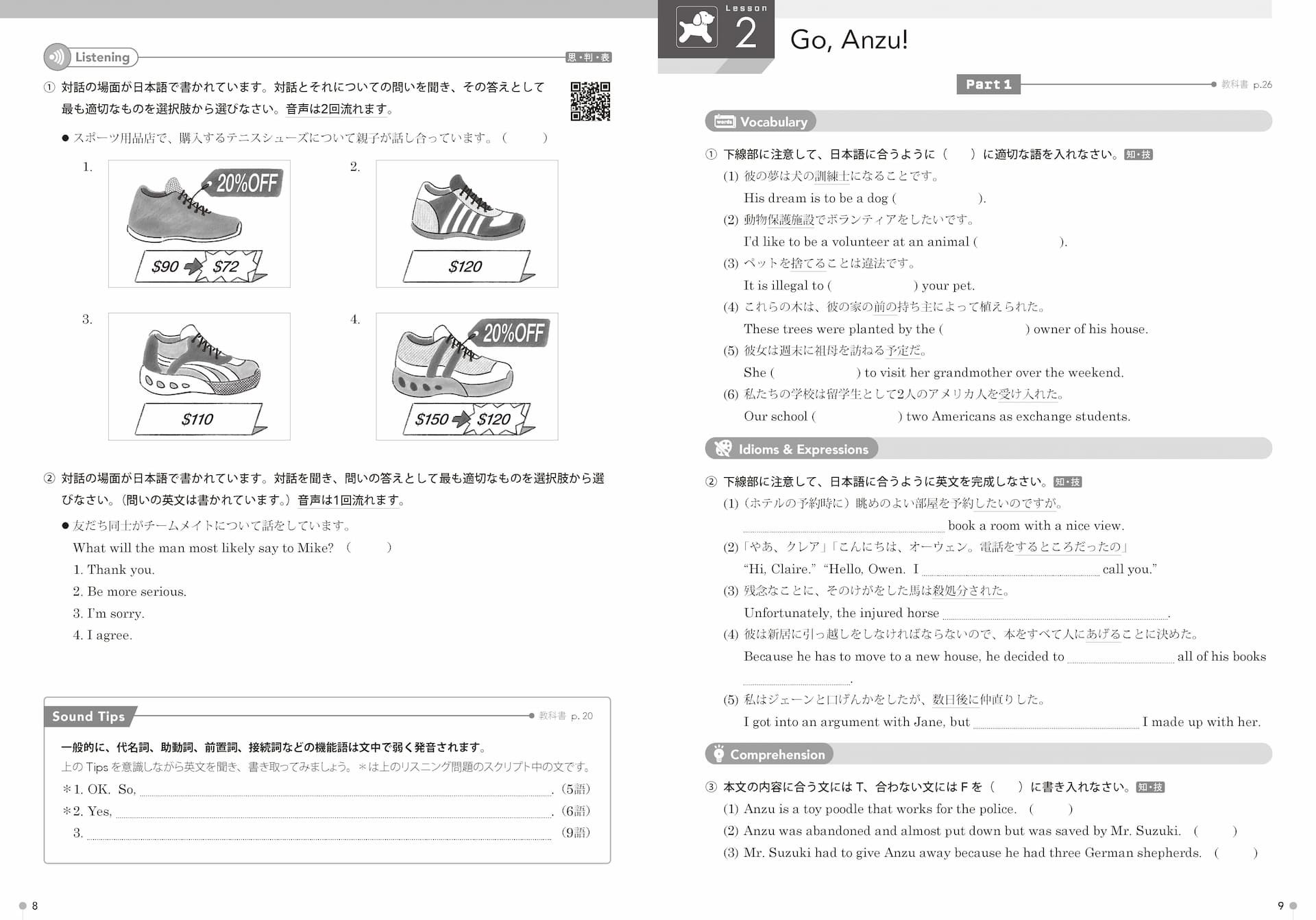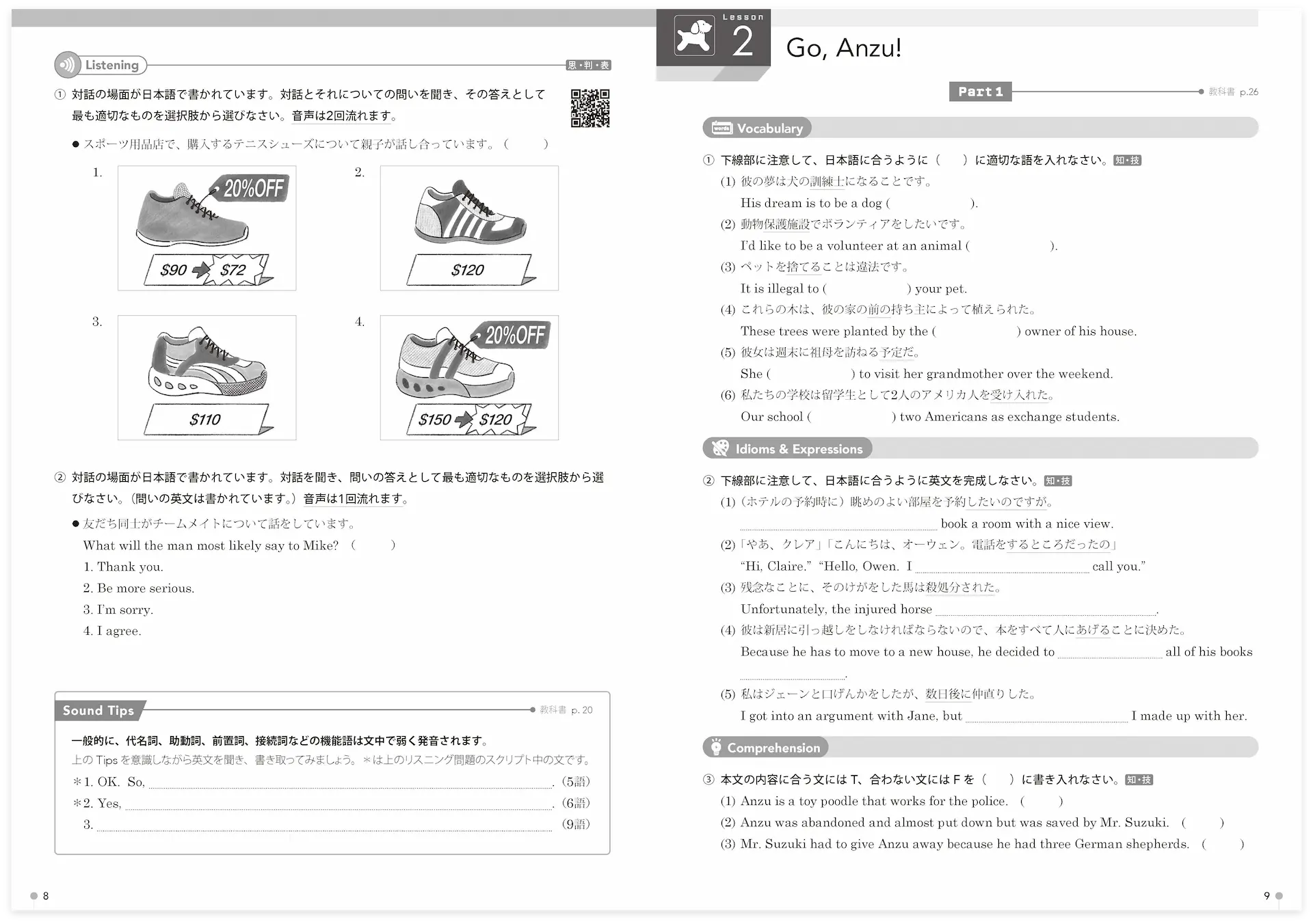 共通テスト形式のリスニング問題です。ページ下のSound Tips は、教科書各課で学んだ英語の音の変化をディクテーションで確認する問題です。これらの問題の音声は、各課のListening のページのQRコードからストリーミング再生で聞くことができます。