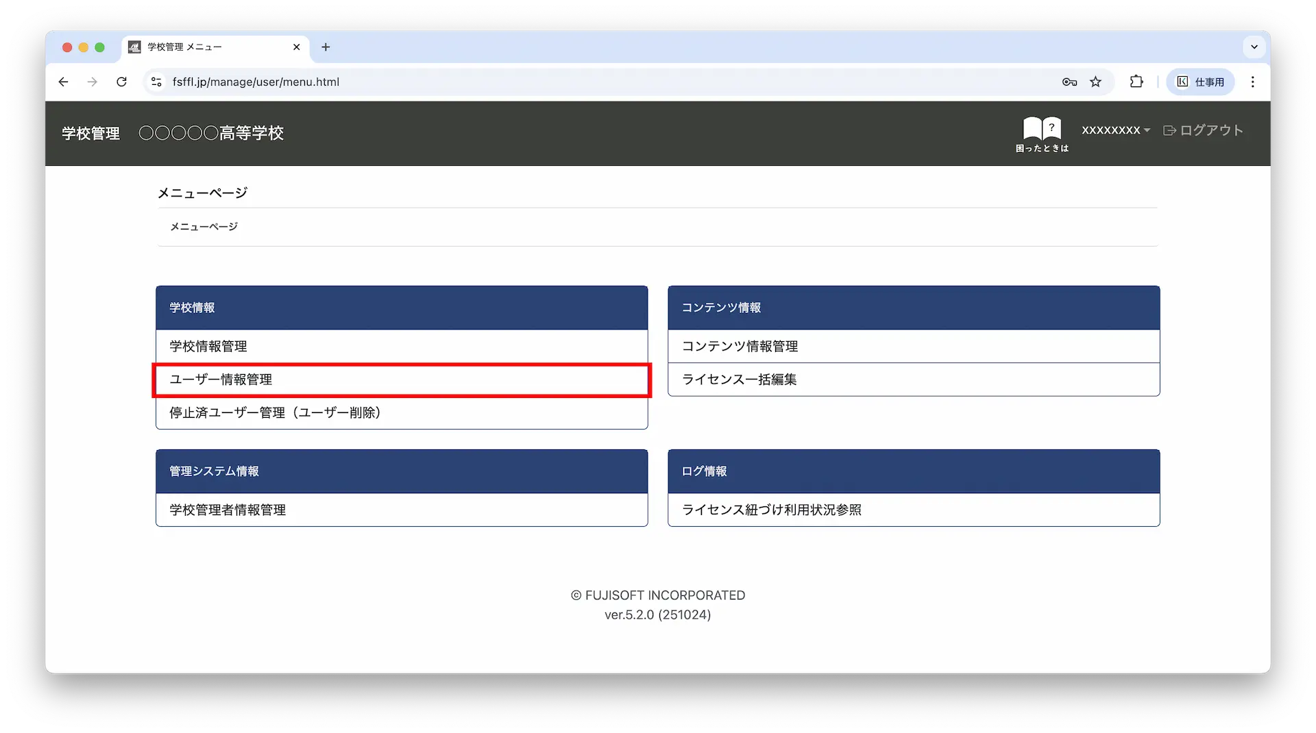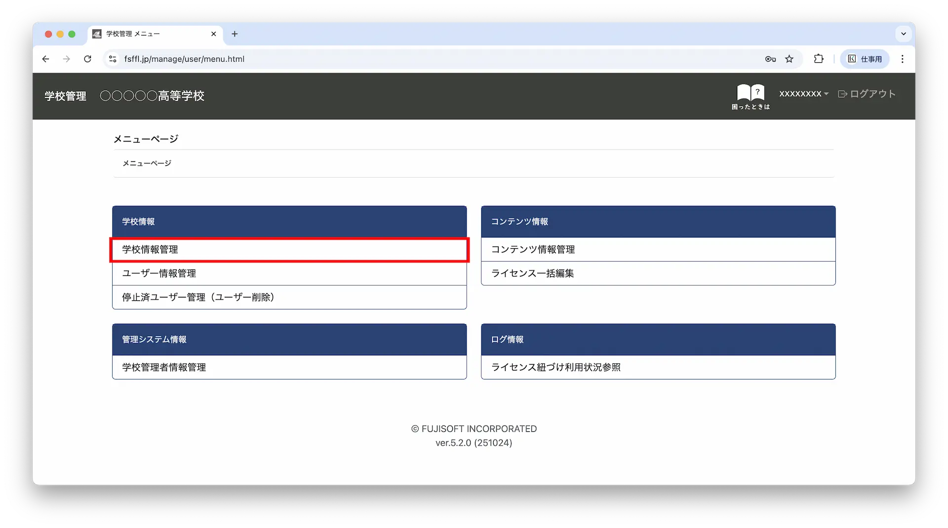 4-1.トップ画面のメニューページに戻り「学校管理情報」をクリックします。※メニューページには画面左上の「学校管理 ○○○○高等学校」をクリックすると遷移します。