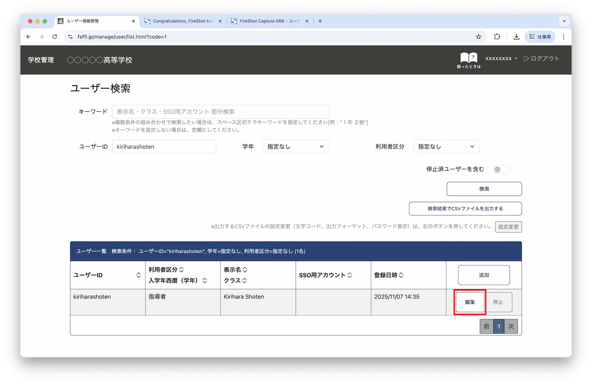 3-1.「ユーザー情報管理」画面で追加したユーザーの列の右側にある「編集」ボタンをクリックします。