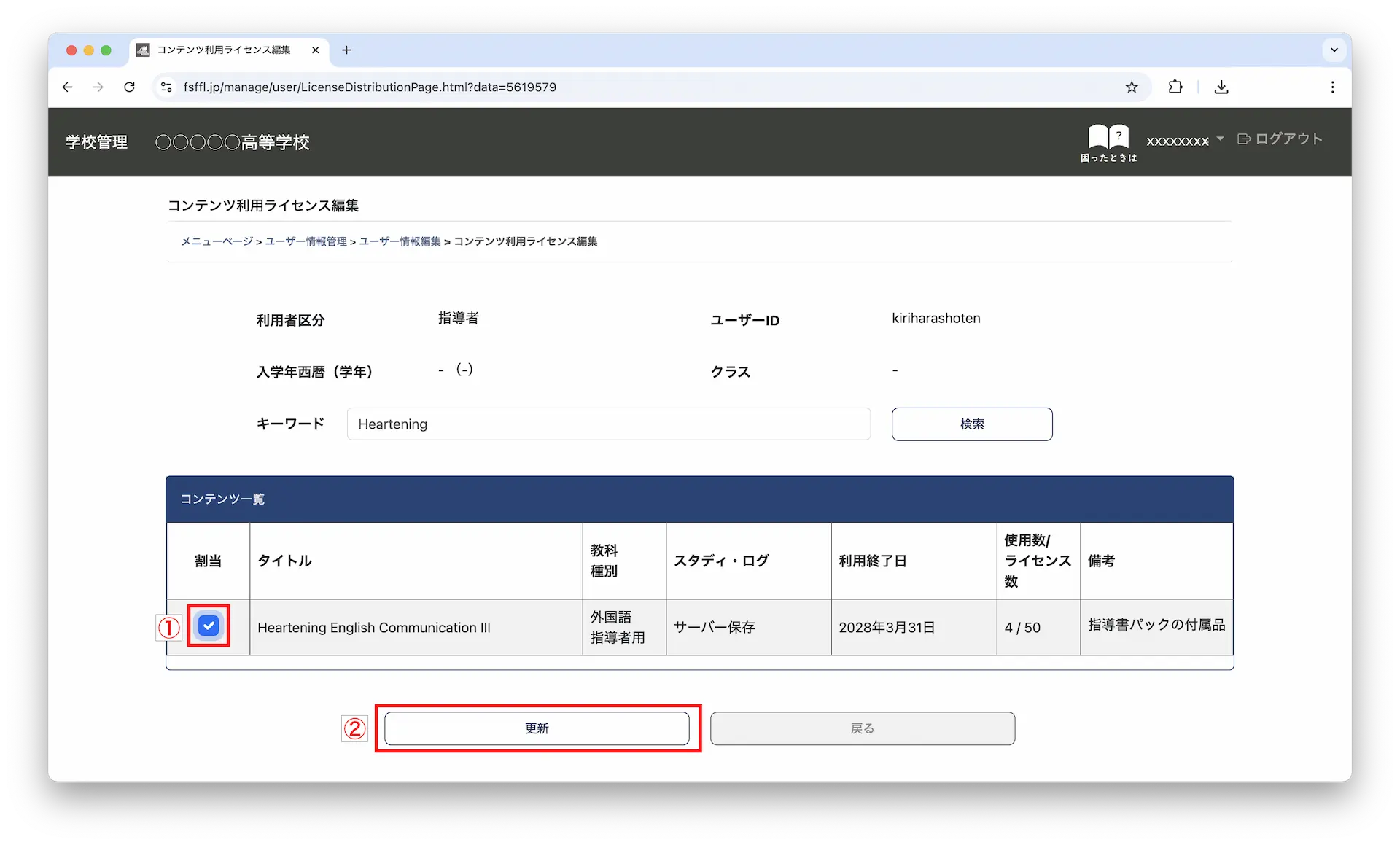 3-3.使用する教材の「割当」にチェックを入れて「更新」ボタンをクリックします。