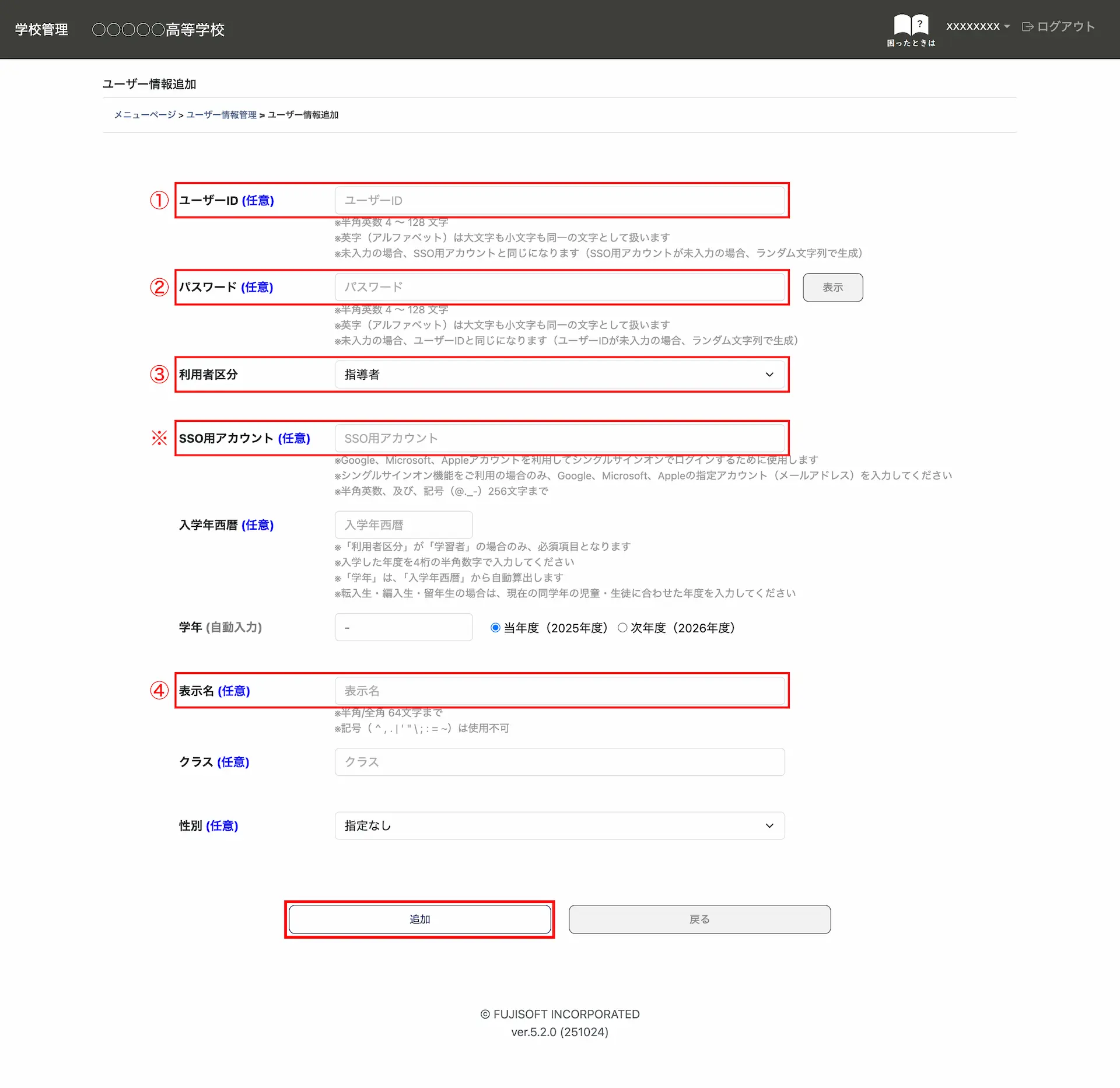 ①ユーザーID:「半角英数字」で入力します。(未入力の場合は、ランダム文字列で生成されます。)