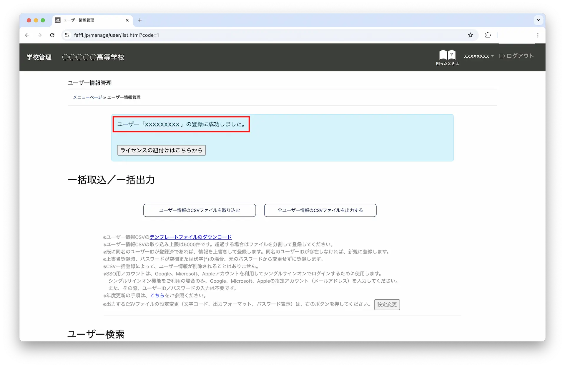 2-5.「ユーザー「xxxxxxxxxx」の登録に成功しました。」のメッセージが表示されたらユーザーの追加は完了です。