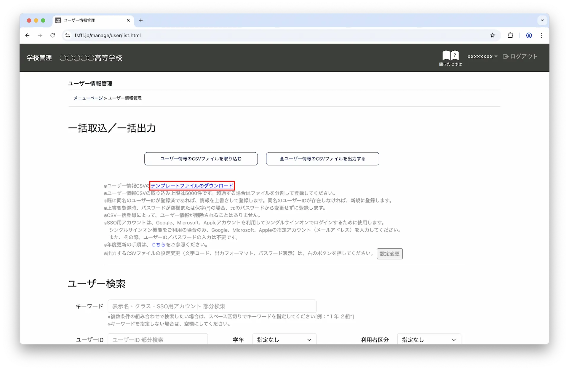 2-2.「テンプレートファイルのダウンロード」をクリックして、ユーザーIDの一括登録に使用するCSVファイルをダウンロードします。