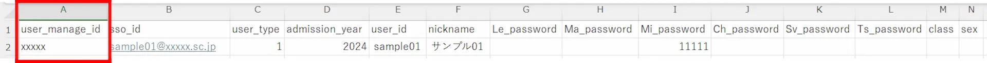 ※2行目のA列の学校ID「user_manage_id」は学校ごとに自動で採番されます。ユーザーの登録に必要な項目になりますので、ユーザー情報の登録にはこのIDを変更せずにご利用ください。